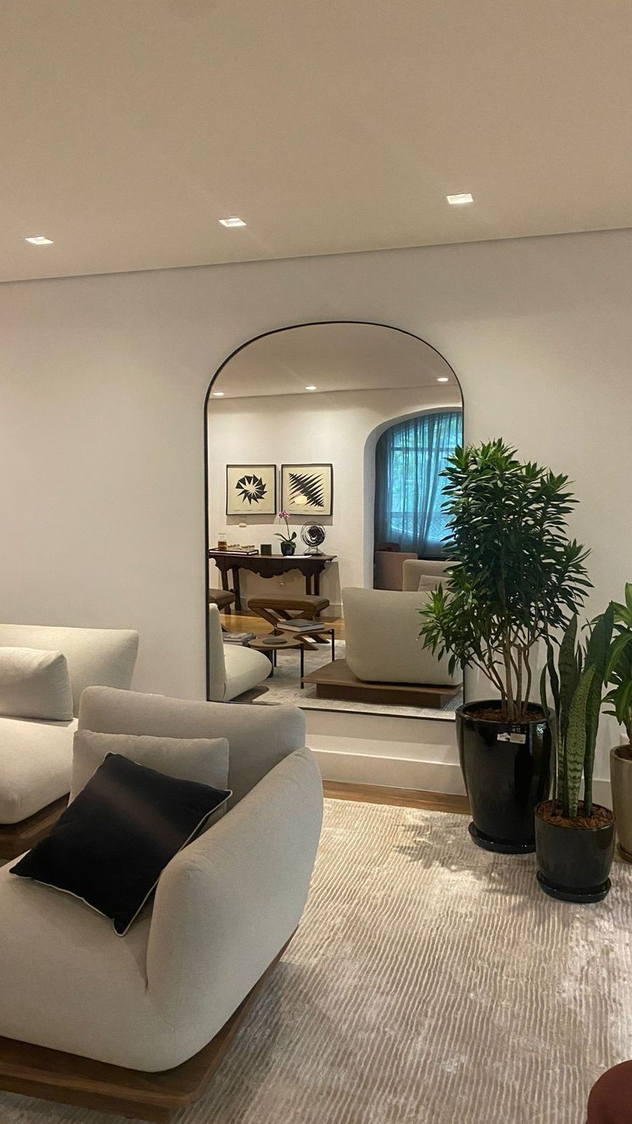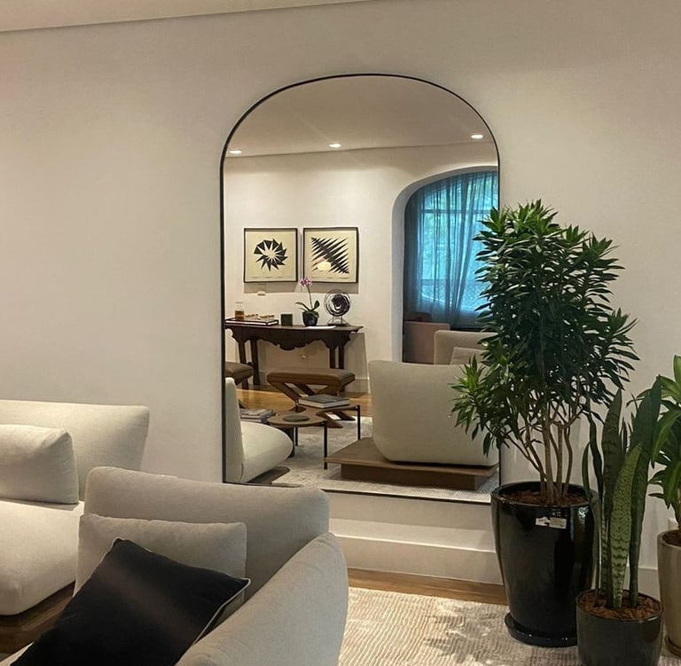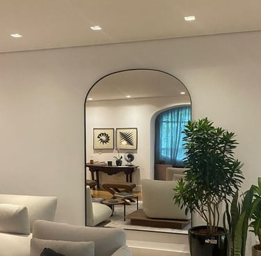 Espelhos estrategicamente posicionados refletem a luz e duplicam a sensação de espaço. Quando combinados com iluminação bem direcionada, criam um efeito de amplitude elegante.
