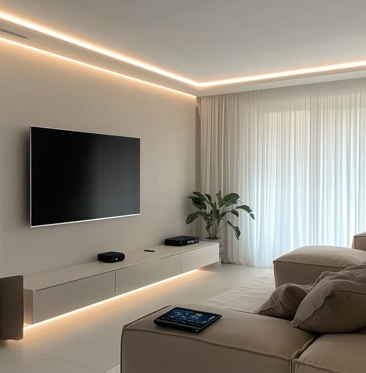 A iluminação próxima ao chão ou em áreas esquecidas dá continuidade ao olhar, criando a impressão de que o espaço é maior. Uma fita de LED sob móveis suspensos é simples e eficiente.